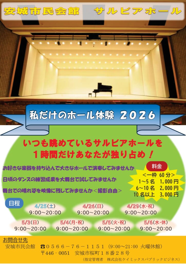 PICKUP!! 私だけのホール体験2026 ”サルビアホールをひとりじめ” 近日発売開始 【日程】 2026年4月25日(土)26日(日)29日(水・祝)/5月3日(日)4日(月・祝)5日(火・祝)6日(水・休) 【会場】 サルビアホール さらに詳しく